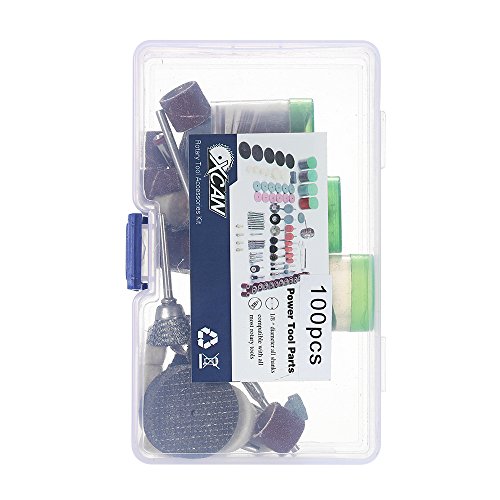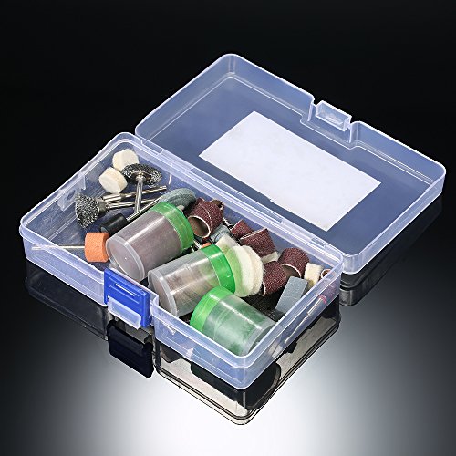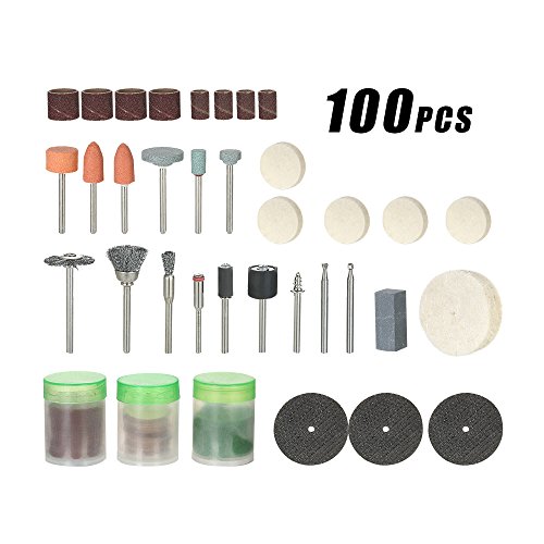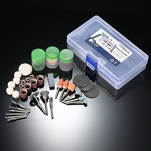 100個回転ツールアクセサリーキットです。研磨ワックス、切削ディスク、研磨石、鋼線ブラシ、繊維切断ディスク、サンディングバンドなどを含んでいます。ハードとデリケートな素材の細部作業に最適です。