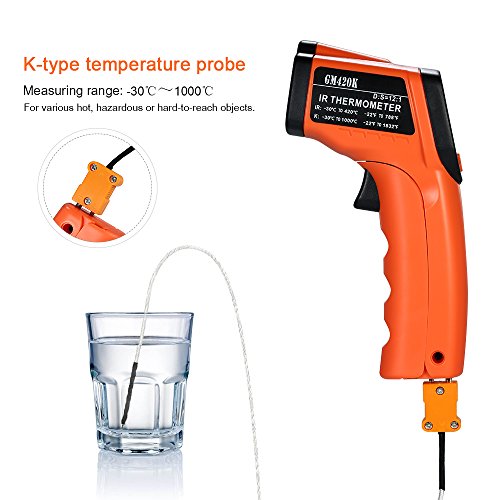 - ▲さまざまな熱い、危険、または届きにくい物体に対して-30℃~120℃の範囲で測定できる-30℃〜420℃の広いIR測定範囲とKタイプの温度プローブ。