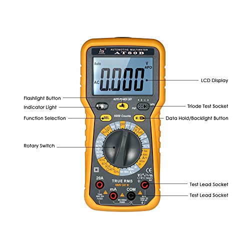 6000カウント表示この自動車のマルチメータは、自動キャリブレーション、高精度と優れた安定性のため最新のソフトウェアの設計を採用しています。大型LCDバックライトディスプレイ、ソフト保護カバー、懐中電灯機能などを備えています。DC / AC電圧/電流、抵抗、静電容量、周波数、デューティサイクル、温度、回転速度、ドエル角、ダイオードと回路、およびhFEテスト機能を測定することができます。
