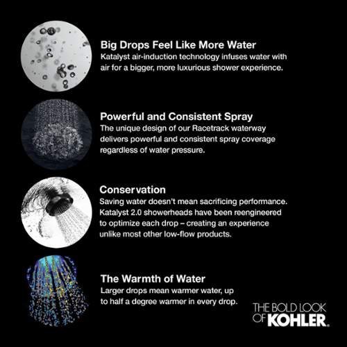 showering experience. With a new nozzle pattern, internal waterway design, and air-induction system, this technology maximizes every water drop and creates a richer, more intense flow of water that heightens the shower's sensory experience. By infusing two liters of air per minute, Catalyst delivers a powerful, voluptuous spray that clings to the body with larger, fuller water drops.