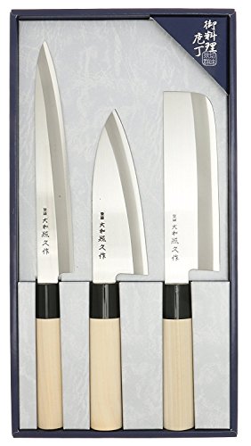 An appropriate knife for the task at hand not only ensures that the job is done properly, but also makes the slicing, chopping and filleting easier. Japanese kitchen knives are made in an array of shapes to suit specific uses. Made to time-honored standards and exacting detail, this knife set offers three of the most commonly used shapes in the Japanese kitchen. The deba knife has a thick spine, gradually narrowing to the knife's edge. This detail, along with the single-edged blade, allows for easy processing of whole fish and large fish fillets into smaller pieces. The yanagi knife is long and narrow and is the tool of choice when slicing fish for presentation for sashimi and sushi. Like the deba, it is beveled and sharpened on one side of the blade only. The single-edged blade, as well as its long and narrow shape, allow the user to slice the fish in one smooth motion, eliminating any damage or tears to the flesh. The nakiri knife has a rectangular shape with squared corners and a thin profile. It excels at cutting vegetables, even making easy work of processing an onion or cabbage into very thin slices.