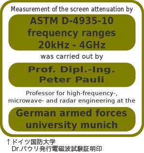 - 電磁波電力密度減衰率 @ 20KHz~4GHz:99%~99.999%(20dB~57dB)