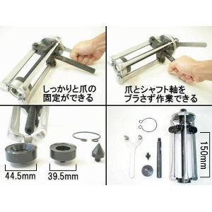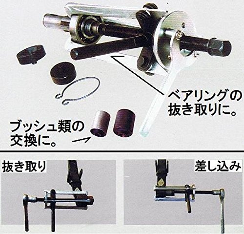 ■ ブッシュリペアツール、三つ爪固定式ベアリングセパレーター、 ブッシュ交換用工具 ■ 総重量 約2.8kg、本格的なプロ仕様の専用工具。 ■ リーフスプリング(板バネ)のブッシュ交換に使用します。 抜き取りと圧入を、一つの工具でこなします。 うまく叩けない箇所や、力を掛けられないところ、バーナーであぶれない現場などでも有効です。 ■ 懐(ふところ)が深いので、シャフトの奥にあるベアリングを抜くことに使用します。 爪の有効作業長がおよそ15センチあるので、長めの爪を活かしての作業ができます。大きなギヤプーラーでは入らない場所に利用できます。 また、ベアリングセパレーターの組みこめない様な狭い場所でも、手前から爪を固定してベアリングやギヤを抜き取ることができます。 ■ プーラーとして使用する場合、 一般的な三つ爪式プーラーに換算すると、およそ250mm規格のサイズと同等の「シャフト長」、「爪の長さ」となります。 この工具の汎用性を考えると、かなりコストパフォーマンスの高い商品です。 ■ ベアリングやシール類の圧入にも使用可能です。 爪を掛ける場所があれば、アタッチメントやソケットレンチなどを使用して、ベアリングやオイルシールなどを圧入、挿入できるので、便利です。 叩いて圧入出来ないデリケートな場所や、油圧プレスを使えない外せないパーツに有効です。 ■ 三つ爪を固定できるロッドが付いており、効果的にベアリングを挟んでおくことができ、とても便利です。(画像参照) ■ シャフトのブレを防ぎ、プーラーをしっかり固定できるハンドルも付いています。(画像参照) 締め込み中のプーラーのズレと、空回りを防ぐ便利な機能です。 ■ シャフトの先端のアタッチメントは、3種類あります。 通常のプーラーとして利用できるものと、 ブッシュリペア、ベアリング圧入などに使えるものです。 リペア用アタッチメントの直径は「39.5mm」と、「44.5mm」の二種類になります。(画像参照) ■ シャフトの有効作業長(ネジの切ってある範囲)は、およそ150mmです。 ブッシュなら、およそ6.5cmの幅のものでも、着脱に対応。 ■ 三つ爪固定可能なベアリングセパレーターとして、抜群のパフォーマンスのあるプーラーです。 ■ 使用対象または適合につきましては、お答えすることは不可能ですので、ご了承ください。 ■ 鍛造の強化型で、品質、強度ともに良好です。 この価格でのご提供は見逃せません。 □□□ 使用につきまして。□□□ 高度な技術を必要とする特殊工具です。 専門知識を有する有資格者による作業が必要です。