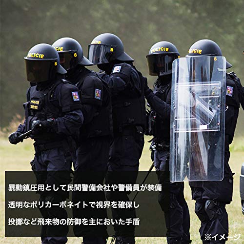 ■ 防犯用防護盾 護身用たて 防護シールド ■ 商品仕様 縦 横:約900 × 465mm 厚 さ:約3.5mm 重 量:約2kg カラー:クリア ■ 透明性・耐衝撃性・耐熱性に優れたポリカーボネイトを使用 ■ 3.5mm厚規格のポリカーボネート。 自動車用カーポートなどに使用される高強度ポリカを、厚さを3.5mmにした盾です。 ■ クリアタイプなので身を守りながら視界を確保 ■ 軽量なので片手で構えられる防護盾です ■ ベルトと取っ手で、腕にしっかり固定 ■ 施設内、事業所内の防犯設備、防犯用品として。 ■ 不審者や暴漢、凶器準備者に対して、いち早く対応します。 ■ 刃物、ナイフや凶器への防刃対策として。 ■ 投石や角材などの衝撃から防御する。 ■ 防犯用品として、サスマタや警棒、防じん手袋などと併せて常備します。 ■■ 注意事項 ■■ 本製品はすべての場合において絶対の安全を保障できるものではありません。 ※大型商品の為簡易包装にてお届けとなります。