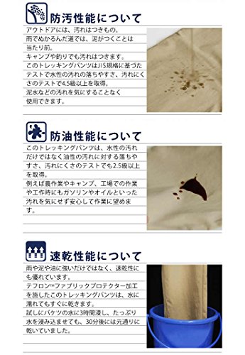 - ●防汚性能:アウトドアには、汚れはつきもの。 雨でぬかるんだ道では、泥がつくことは当たり前。キャンプや釣りでも汚れはつきます。 ラドウェザーのトレッキングパンツは、水性の汚れの落ちやすさ、汚れにくさのテストで4.5級以上を取得。 泥水などの汚れを気にすることなく使用できます。 ●防油性能 このトレッキングパンツは水性の汚れだけではなく、 油性の汚れに対する落ちやすさ、汚れにくさのテストでも2.5級以上を取得。 例えば農作業やキャンプ、工場での作業や工作時にも、 ガソリンやオイルといった汚れを気にせず安心して作業に望めます。