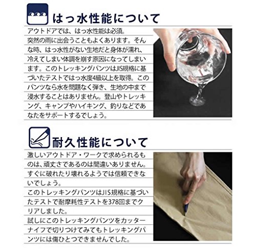 - ●撥水性能:アウトドアでは、はっ水性能は必須。突然の雨に出会うこともよくあります。 はっ水性がない生地だと身体が濡れ、冷えてしまい体調を崩す原因になります。 ラドウェザーのトレッキングパンツは、はっ水度4級以上を取得。 このパンツなら水を問題なく弾き、生地の中まで浸水することはありません。 登山やトレッキング、キャンプやハイキング、釣りなどであなたをサポートするでしょう。