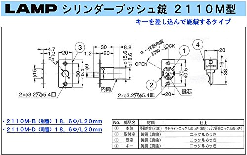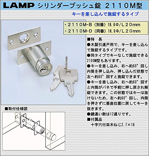 シリンダープッシュ錠 【18.6Φ/L20mm】 木製引違戸用 キーを差し込んで施錠するタイプ。 [ランプ]印