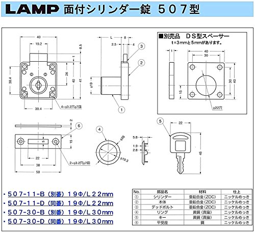 シリンダー錠 『面付』 【LAMP】 スガツネ 家具用 鍵 ロック スガツネ 507-30-B 《別番》 【19Φ/L30mm】 家具用 鍵 ロック