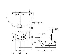 ■特 長 ●フックが180°回転します。 ●フリクション(抵抗機構)により、振動による首振りを防止します。 ●フックの先端が球状なので、安心してご使用いただけます。 ■付属品 十字穴付皿木ねじ3.5×20(ステンレス鋼)