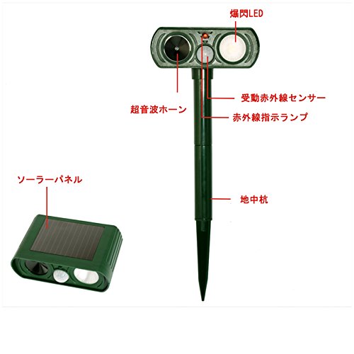 - 【超音波】動物が嫌う超音波付き、有効範囲に入る猫、犬、ネズミ、キツネどの動物を傷つけずに追い払います。