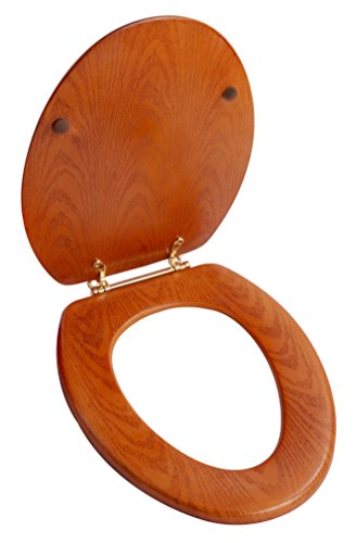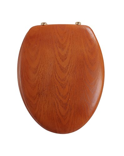 Oak, elongated, Wood seat with polished brass hinges, Durable finish with solid color throughout, Easy to install hinges come with non-corrosive nuts, Color-matched bumpers