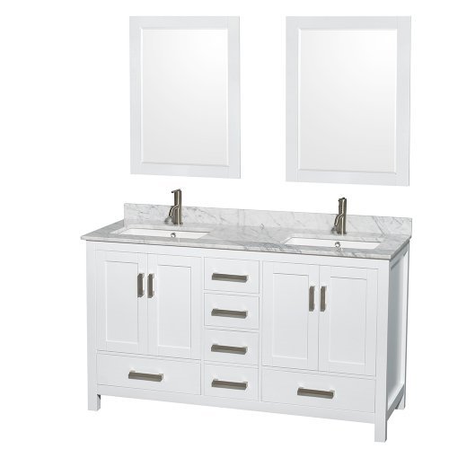 Wyndham Collection Sheffield 60 inch Double Bathroom Vanity in White White Carrera Marble Countertop Undermount Square Sinks and 24 inch Mirrors