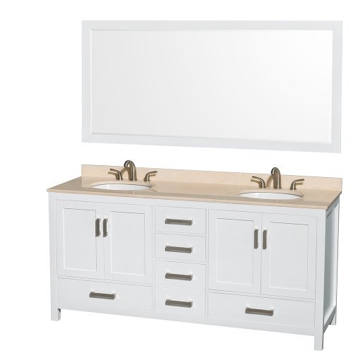 Wyndham Collection Sheffield 72 inch Double Bathroom Vanity in White Ivory Marble Countertop Undermount Oval Sinks and 70 inch Mirror