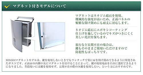 - ワンタッチで扉を開け閉めできる!マグネットモデル マグネットはネオジム磁石を使用。機械的な強度が高いため、正面パネルの頻繁な開け閉めにも頑丈に対応します。 ネオジム磁石にエポキシコーティング仕上げを施しているのでキズがつきにくく美しい光沢を保ちます。 旅行など長期不在の場合は、鍵もそのままご使用いただけますので防犯性もばっちりです。 マグネットモデルは、鍵を使用しないときでもワンタッチで楽に扉を開け閉めできるように開発されたポストです。 正面扉の内側中央にマグネットを付けることによって、鍵の使用場面を自由に選択できるようになりました。 普段使いには鍵を使用せず、長期不在の際のみ鍵を使用したい、という方におすすめです。 【商品サイズ】横303mm×縦380mm×厚み137mm