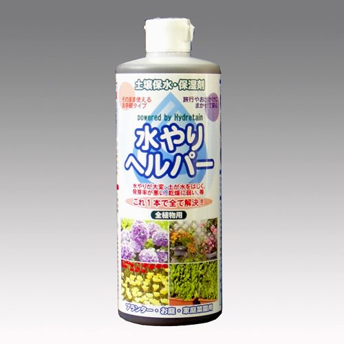 Hydretain原液を希釈配合した「水やりヘルパー」は植物の生育に欠かせない水分をしっかりと根に行き渡らせるために開発された、有機成分が主原料の安心してお使いいただける土壌保水・保湿剤です。本液を3カ月に1回施用するだけで、その間の水やり回数が半減できます。旅行や外泊のたびに心配だった水やりが、これ1本にまかせて安心。乾燥しやすいベランダやテラスに置いた鉢物・菜園プランター、水遣りの時間が取れにくいご自宅のグリーンカーテンや乾燥しやすい屋上緑化やお庭の芝に是非お試しください。