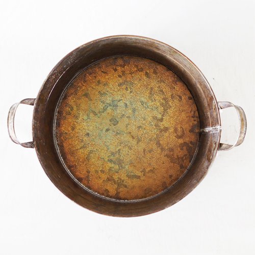 アンティークブラウンのブリキの取っ手付き丸型プランターです。寄せ植えされる時は鉄キリで底穴を空けるかネオコールやエコラン土のような水耕栽培用売培土をお使いください。