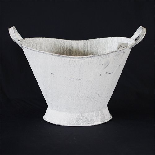 アンティークシルバーのブリキの耳付き楕円型ポットです。寄せ植えされる時は鉄キリで底穴を空けるかネオコールやエコラン土のような水耕栽培用売培土をお使いください。