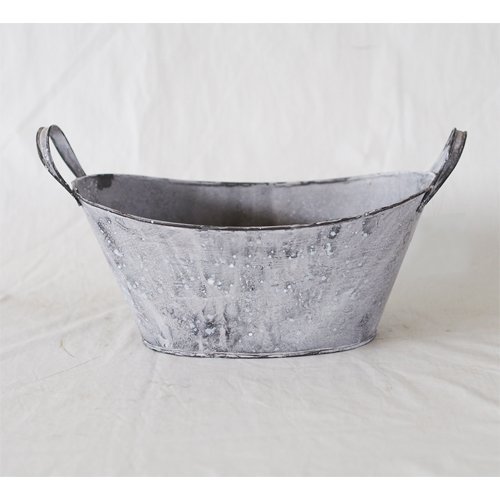 アンティークシルバーのブリキの耳付き舟型ポットです。寄せ植えされる時は鉄キリで底穴を空けるかネオコールやエコラン土のような水耕栽培用売培土をお使いください。