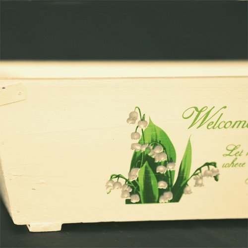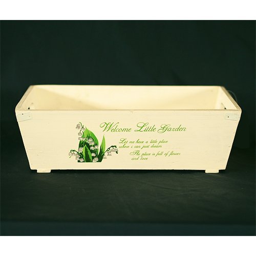 スズランのイラストの入ったお洒落なウッドボックスです。2本の部材を底に入れていますので水はけも良く、穴を空けて寄せ植え用としてもご利用ください。