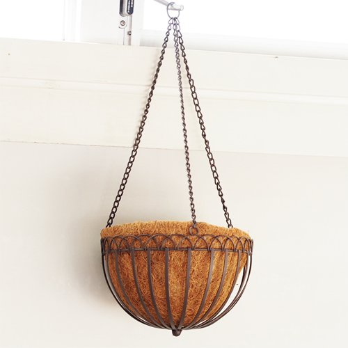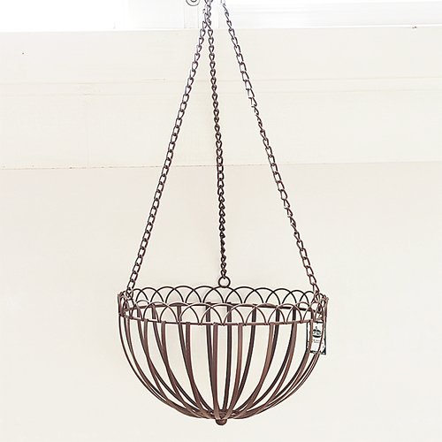 天井吊下げ型アイアン製バスケットです。グリーンを鉢ごと入れるのもよし、別売りのココファイバーシートを内貼りして花苗の直植えアレンジも可能です。お洒落な空間演出用にお使いください。