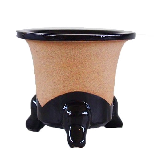 生産地不明の足付オモト鉢です。素地は炻器質の陶器です。上部縁周りと足元に黒の釉薬を掛け、残りはきれいなベージュの素地のままですが、それがおしゃれなデザインに仕上がっています。