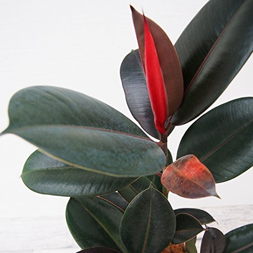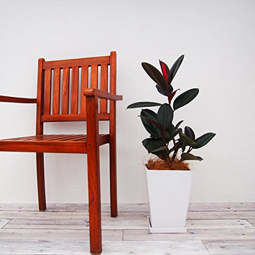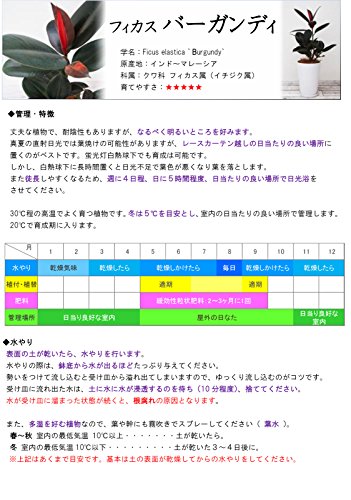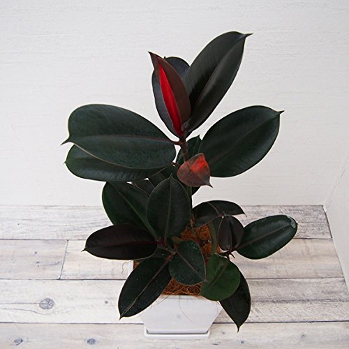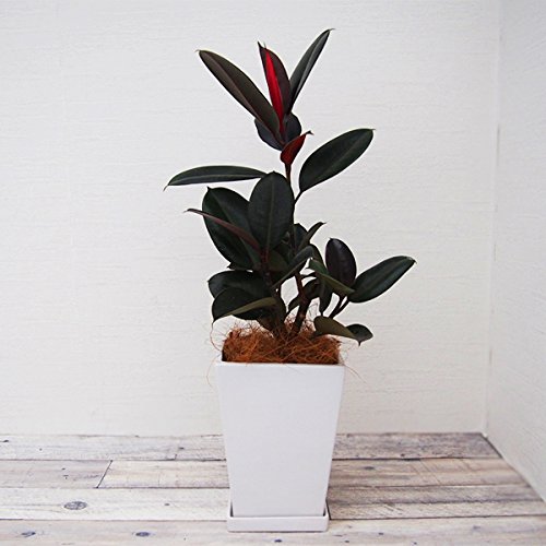 葉が赤黒味を帯びたシックでスマートなゴムノキ、フィカス・バーガンディです。深紅の新芽と光沢のある黒い葉のコントラストの美しさが、唯一無二の美しさと色気を漂わせています。太陽光線の下でより葉色が冴える観葉植物です。植込みの鉢にはホワイト色の高品質陶器鉢を選びました。丈夫で強く、育てやすい植物なので、初心者でも安心して管理できます。