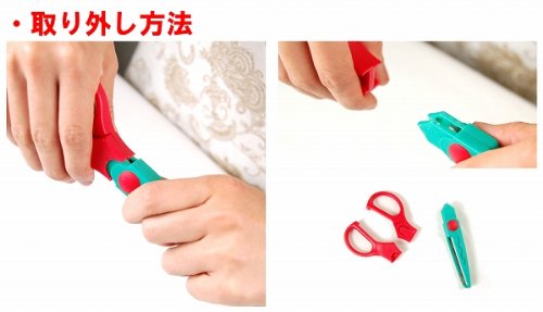<換え刃交換方法> 1.ハサミの持ち手の先端と、刃の付け根を両手でしっかりと持ち、引っ張り出すようにして刃を持ち手から取り外します。 ※接続が硬い作りとなっておりますので、周囲に注意して作業を行ってください。 ※持ち手部分は、取り外すと2つに分解されます。 2.分解された持ち手を、取り外し前と同じ状態に重ね合わせ、使用したい換え刃に取り換えます。 ※換え刃は、奥までしっかり装着してください。 <ご注意> ・刃のかみ合わせは、キツメに作られております。 ・刃の接続部は、緩み防止の為、硬めの作りとなります。 ・刃の交換時は、周りに注意して作業してください。 ※勢い余って自分自身や周囲に被害が及ぶ危険がございます。