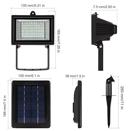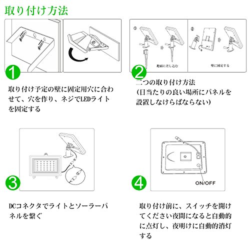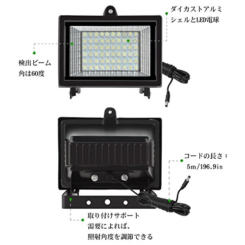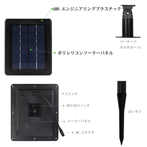 - IP65防水等級:ソーラーパネルと金属素材の投光ライトは、良好な耐水性素材を採用して組み立てている。有効的に日光、雨、雪、雹、風 に耐えられます。
