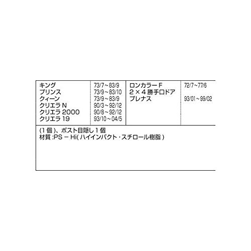 商品部品コード DASZ309 商品名・期間 キング73/7~83/9、プリンス73/9~83/10、クィーン73/9~83/9、クリエラN90/3~92/12、クリエラ2000 90/8~92/12、クリエラ19 92/6~04/11、ロンカラーF77/5~ 部品名称 ポスト目隠し 備考:本体セット×1、ネジは現在ご使用のものをお使いください 部品 色 ホワイト