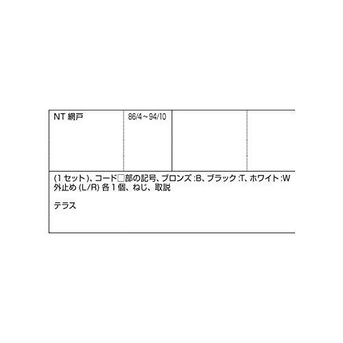 商品部品コード [FNMB016] 商品名 発売時期:NT網戸86.10~94.9 部品名称 外れ止めA NT網戸外れ止めセット 備考:本体×2(LRセット)、取付ネジセット×2 色 ブロンズ