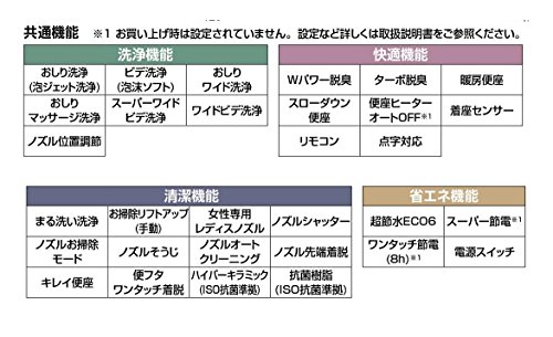 - 共通機能:洗浄機能/おしり洗浄(泡ジェット洗浄) ビデ洗浄(泡沫ソフト) おしりワイド洗浄 おしりマッサージ洗浄 スーパーワイドビデ洗浄 ワイドビデ洗浄 ノズル位置調節、快適機能/Wパワー脱臭 ターボ脱臭 暖房便座 スローダウン便座 便座ヒーターオートOFF 着座センサー リモコン 点字対応、清潔機能/まる洗い洗浄 お掃除リフトアップ(手動) 女性専用レディスノズル ノズルシャッター ノズルお掃除モード ノズルそうじ ノズルオートクリーニング ノズル先端着脱 キレイ便座 便フタワンタッチ着脱 ハイパーキラミック(ISO抗菌準拠) 抗菌樹脂(ISO抗菌準拠)、省エネ機能/超節水ECO6 スーパー節電 ワンタッチ節電(8h) 電源スイッチ