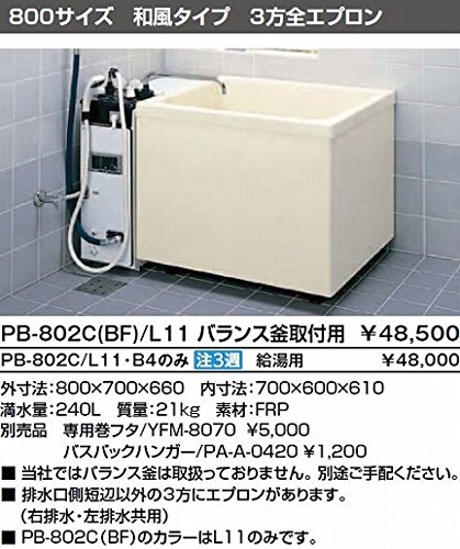 INAX ポリ浴槽 【PB-802C(BF)/L11】 バランス釜取付用(穴あけ済) (右/左排水共用) ポリエック 800サイズ 和風タイプ 3方全エプロン