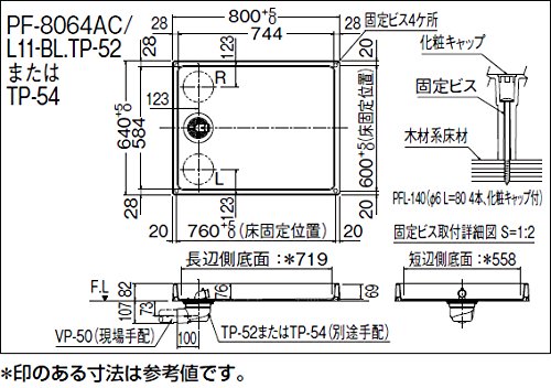 寸法:800×640×82mm 材質:PP 付属品:固定取付金具(コーナー固定ねじ・化粧キャップ)/PFL-140 *トラップは別売 洗濯機パン・・・中央排水PF-8064AC/L11-BL 左排水 PF-8064AL/L11-BL 右排水 PF-8064AR/L11-BL