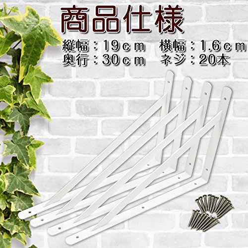 LUCINA L字型 棚受け金具 アイアンブラケット 4本セット ビス付き (300×190×16mm, ホワイト)