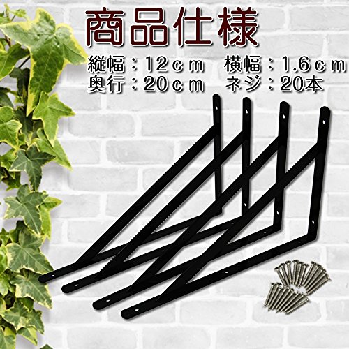 LUCINA L字型 棚受け金具 アイアンブラケット 4本セット ビス付き (200×120×16mm, ブラック)