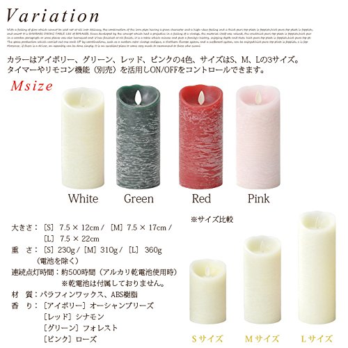 【LEDキャンドル ピラーキャンドル】シリーズは、特許技術を使ったリアルなゆらぎと、アロマ入りロウを使ったリアルな質感にこだわったLEDキャンドルです。火を使わないLEDキャンドルなので安心してご使用いただけます。省エネ技術の向上により、単2形乾電池2本使用で、連続点灯が約500時間可能となりました。電池交換で繰り返しご使用いただけますので経済的です。複数台で使用するのに便利なリモコン対応(別売)なので、一括操作にも役立ちます。タイマー機能搭載で、1度タイマーをセットしておけば、毎日同じ時間に自動点灯し、5時間後に自動消灯してくれますので、消し忘れの心配もありません。