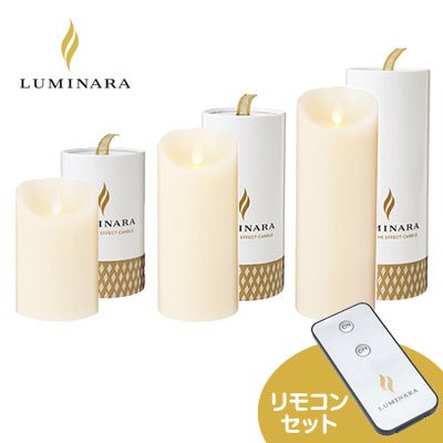■セット内容:Sサイズピラー×1、Mサイズピラー×1、Lサイズピラー×1、専用リモコン×1■キャンドルの炎のゆらぎをリアルに再現し、本物のような演出が出来るキャンドル型LEDライト。LEDライト使用のため、キャンドルを置けなかった場所、管理が出来ないときにもキャンドルのリアルな灯りやゆらぎを楽しむことができます。■ルミナラは乾電池使用のため、コンセントがなくてもお好きな場所で連続500時間の連続使用が可能です。また、タイマー機能付きのため、決まった時間に毎日約5時間点灯可能。■ベッドサイドや書棚、ホテルのロビーやゲストルームなど場所を選ばず、キャンドルの雰囲気を楽しめます。また、アートフラワーやプリザーブドフラワーなどデリケートな花材にも安心してご使用になれます。■本体サイズ:Sφ75×120mm、Mφ75×H174mm、Lφ75×H222mm■色:アイボリー■香り:ローズの香り付き(約1~3ヶ月持続)■連続点灯時間:約500時間 ※アルカリ単二乾電池2個使用の場合 ※タイマー機能付き■材質:パラフィンワックス・ABS樹脂