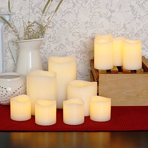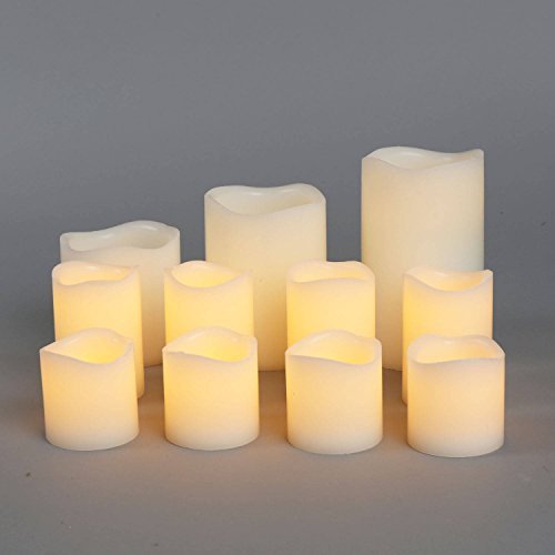 炎のないキャンドル。サイズを各種取り揃えました。家中に置いたり、テーブルにまとめて置いたりできます。目を引くことでしょう。電池駆動のキャンドルにはそれぞれLEDが1個あり、柔らかな揺らめくあかりを灯します。ピラーキャンドルそれぞれにはタイマーがあるので安心です。