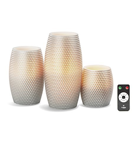Set of 3 Honeycomb Carvedワックスフレイムレスキャンドル、8関数リモート、電池付属 シルバー LC003691