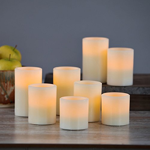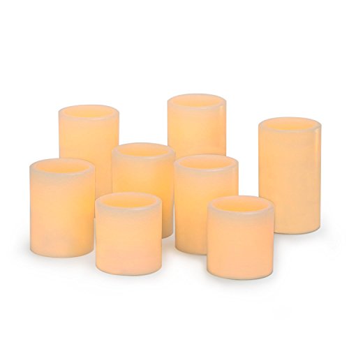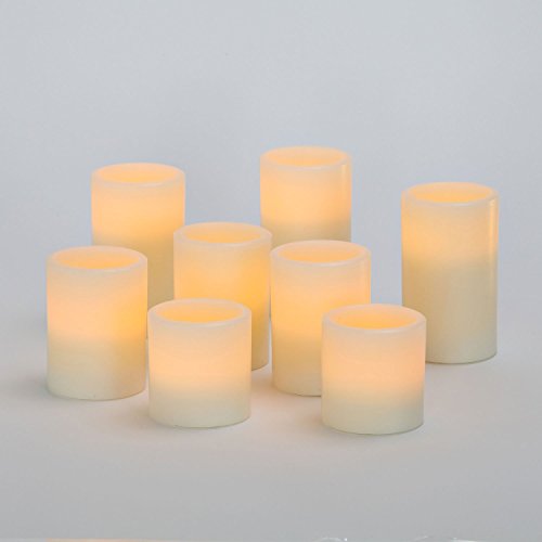 - DESCRIPTION: Set of 8 cream flameless wax candles in various sizes. Each candle includes 1 Warm White LED.