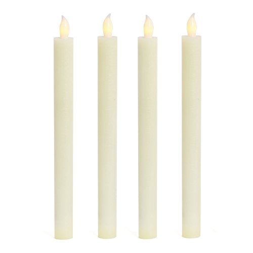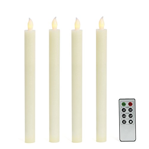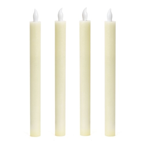 - Description: Set of 4 Smooth Flameless Ivory Wax Taper Candles with Warm White LED per Light. 8 Function Remote included.