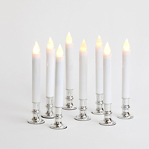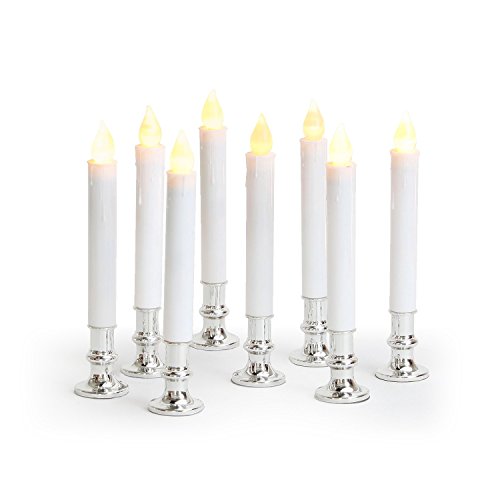 Set of 8 Flameless Plastic White Taper Candles with Removable Silver Candleholders and Remote, Batteries Included [並行輸入品]