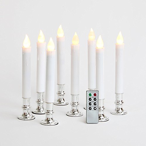 - Description: Set of 8 white resin tapers with a warm white LED and silver removable holders. Perfect for indoor and outdoor use, these remote controlled taper candles with removable holders a simple solution to everyday decor.