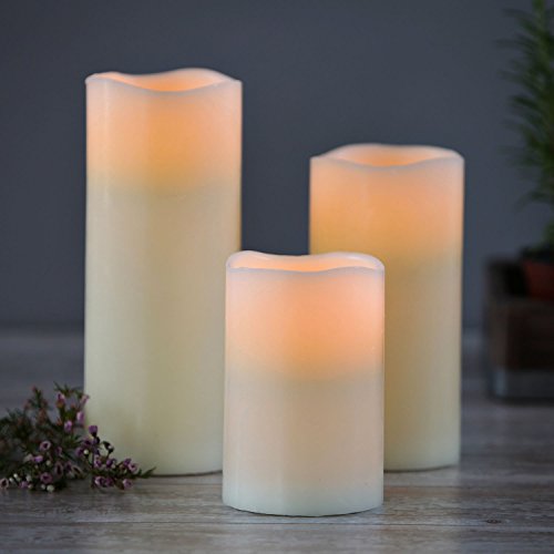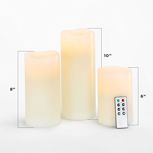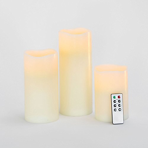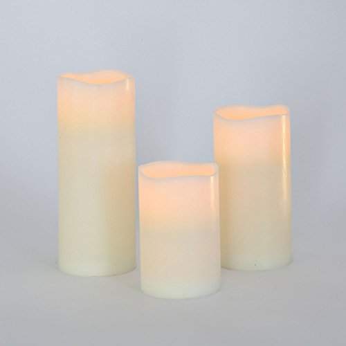 LED technology allows the candles to look and feel realistic while remaining cool to touch and safe for all events and spaces.. These three melted edge flameless wax pillar candles are a great set for adding a warm note to your home's current decor or as an inviting addition to your office or studio space. Each set of 3 includes a remote that allows you to control power, brightness, choose between 4- and 8-hour timers, as well as a static or flickering glow.