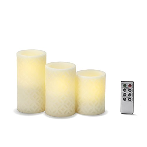 説明:ユニークなラティスデザインのアイボリー色ワックスピラーキャンドル3本セット。各フレームレスキャンドルには明るいウォームホワイトLEDが1つ付いています。こららのキャンドルはどんなパーティーやディナーテーブル、リビングスペース、ウェディングにも華をそえます。クリスマスにも最適。こられのキャンドルはホリデーシーズンに最適な装飾品です。
