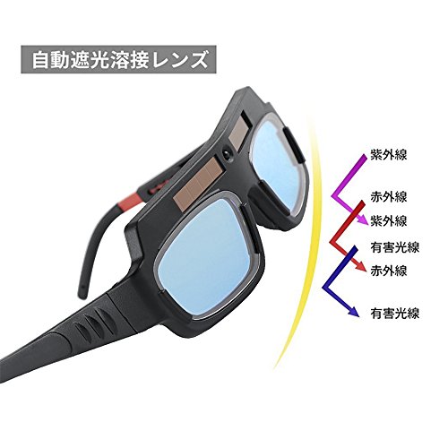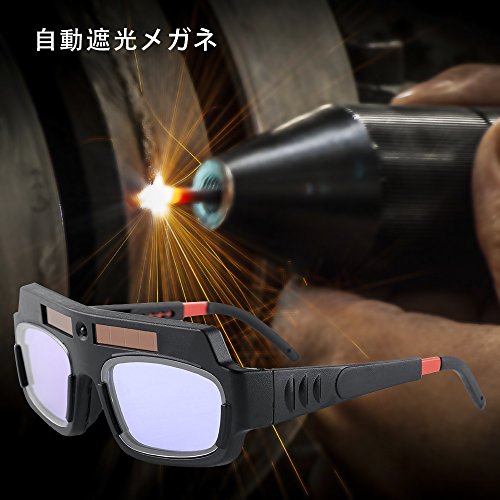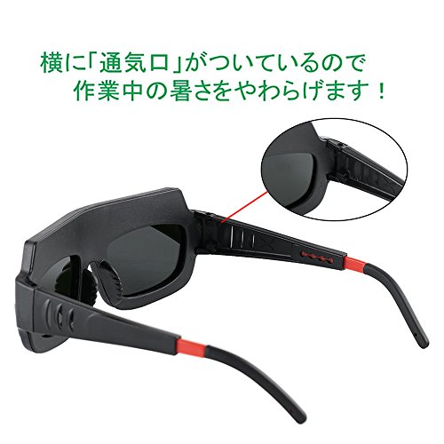 - 溶接の光に反応して自動遮光してくれるサングラス型の遮光メガネです。マスクタイプに比べても簡単に装着できて、軽量で作業時の暑さも軽減できます。