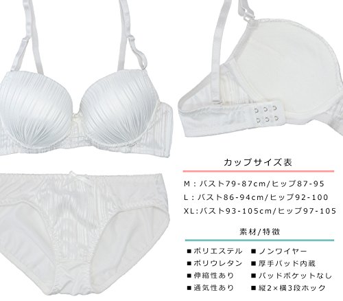 - カラーはブラック、ホワイトの2色から、サイズは、M・L・XLの6サイズからお選びいただけます。詳しいサイズはサイズ表を参考にお選びくださいませ。程よく施されたラインが高級感とセクシーさを演出してくれます。ブラ、ショーツ共にノーマルなデザインなので幅広い年代の方に愛用していただけます。