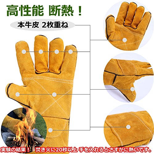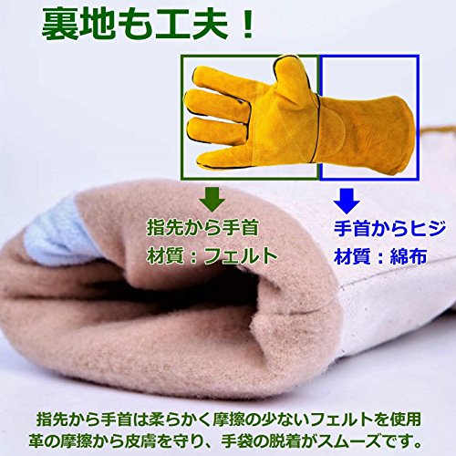 - 【 機能性、耐久性が抜群 】●手首からヒジの手前あたりまで革に覆われるので、ヒジから指先まで暖炉・焚き火の高熱を防ぐことができる防熱手袋です。●手首・手のひら・親指先までの部分は牛革の2重構造になっています、手首から5本の指先までは内部はフェルトでおおわれています。素材自体が柔らかく、快適な上に断熱でもある高機能な耐熱手袋です。