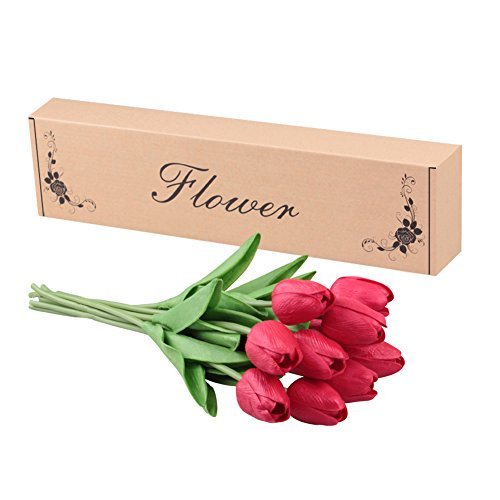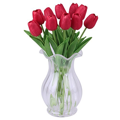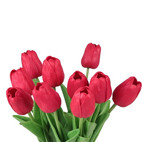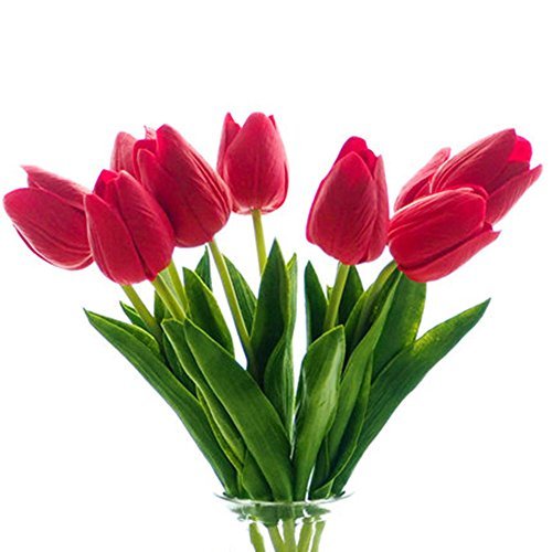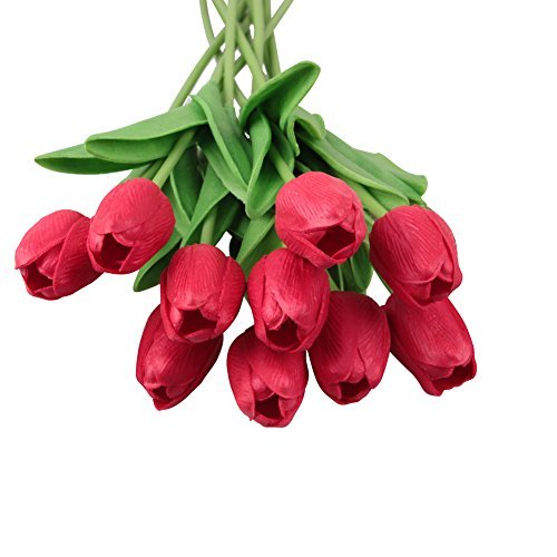 シングルステム10頭人工チューリップリアルタッチPUチューリップフラワーアレンジメントブーケホームルームオフィスセンターピースパーティーウェディングインテリア(赤)