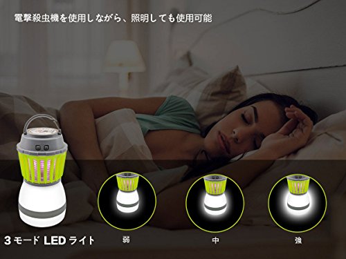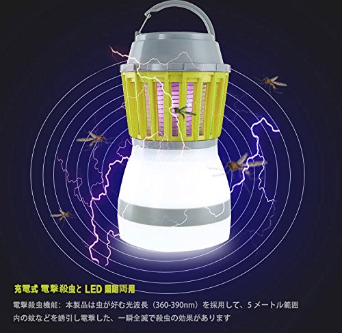 本製品は充電式の電撃殺虫器とLED照明両用です。電撃殺虫として虫が好む光波長(360-400nm)を採用して、5メートル範囲内の蚊などを誘引し電撃した、一瞬全滅で殺虫の効果があります。電撃殺虫を使用しながら、照明しても使用可能です。LEDライト部分は3モード(強・中・弱)があり、三つの明るさを提供します。